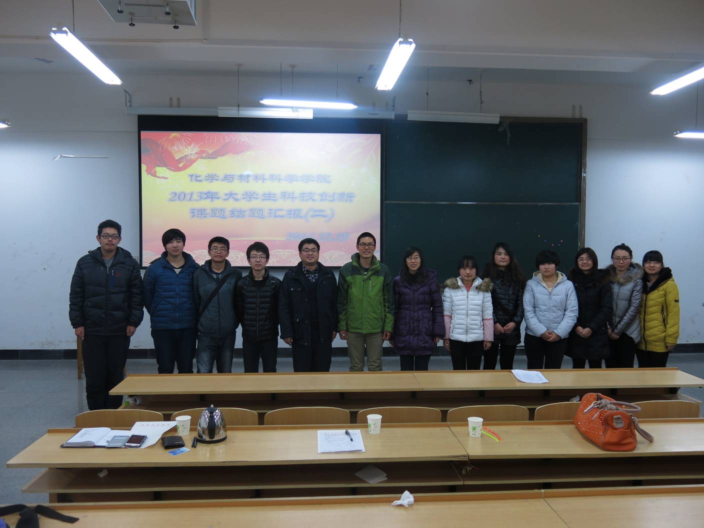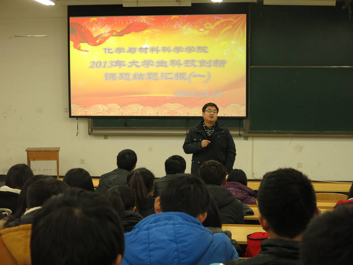 首先,崔老师做了简单的致辞,然后宣布报告开始。接下来按照回报次序依次进行汇报,汇报主要分为两个阶段:研究课题和研究结果讲述阶段和评阅专家提问阶段。每位同学将自己精心准备的PPT报告向在座的观众们进行详细的讲解,并获得阵阵掌声。同时,各位评审专家深入浅出的提问,又能引导同学更加细致的了解课题研究意义和研究重点、难点,从而使同学能够更全面的了解课题。报告会结束后,崔老师做了总结,对12级参加大赛的学生表示赞赏和鼓励,同时,也鼓励2013级、2014级学生积极参与科技创新活动。