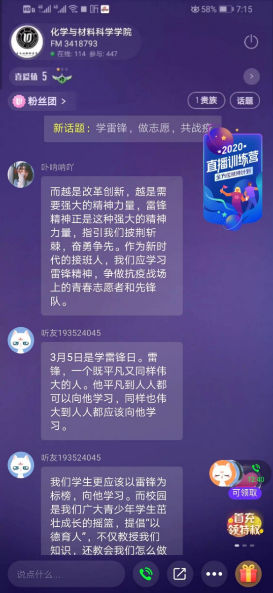 晚七点整,伴随着主持人娓娓道来的英雄故事,一场特殊的团日活动正式开始。随后,几位主持人分别播读了各团支部选送的优秀稿件,不同的文字、各色的声线传递出同样的感情——对英雄们的敬仰之情和传承发扬雷锋精神的决心。接下来的连线环节中,同学们积极踊跃地抢麦,纷纷表达对医护人员和支援者们的敬意。没有获得连线机会的同学,也在直播间通过文字为英雄们送上祝福。最后,李楠对本次活动作出总结:“雷锋精神的实质和核心是全心全意为人民服务,是为人民的事业无私奉献。传承和发扬雷锋精神,并非苛求我们每个人作出一番惊天动地的英雄事迹,而是将为人民服务的宗旨融入自己的日常生活中,以饱满的热情和扎实过硬的本领服务社会、服务人民。”