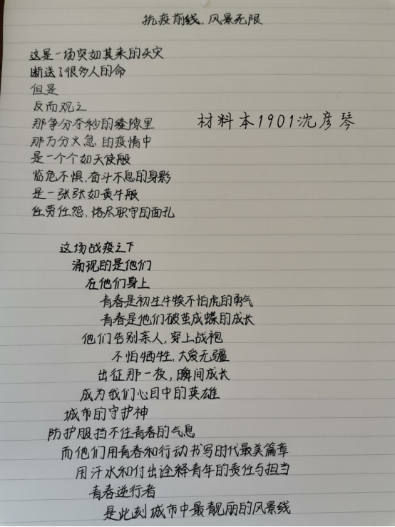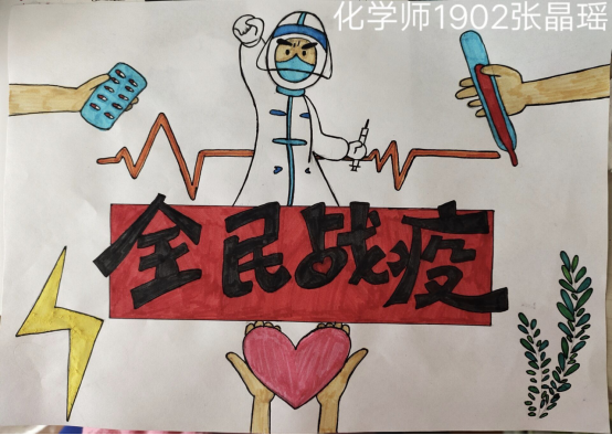 活动中,同学们通过诗歌、短文、绘画等形式,描绘出白衣战士们勇敢坚强背后的压力和辛苦,深切地表达了对白衣战士们不怕牺牲、勇担重任的崇敬之情,同时也表达了同学们对白衣战士们辛勤付出的感激之情。材料本1901班的沈彦琴同学写下:“逆行者们用青春和行动书写时代最美篇章,用汗水和付出诠释青年的责任和担当。”一首首诗歌、一幅幅绘画背后是一颗颗滚烫炽热的心,表达着化学院全体师生与一线工作人员齐心协力、共抗疫情的决心。