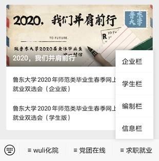 鲁大化院团总支微信公众号求职就业专栏中目前分设企业栏、编制栏、学生栏、信息栏四大板块。
