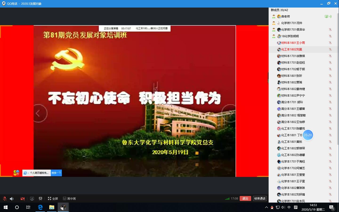 5月19日下午第81期分党校培训班依托qq群课堂举行《不忘初心使命,积极担当作为》专题党课,党总支书记于兆玲主讲。