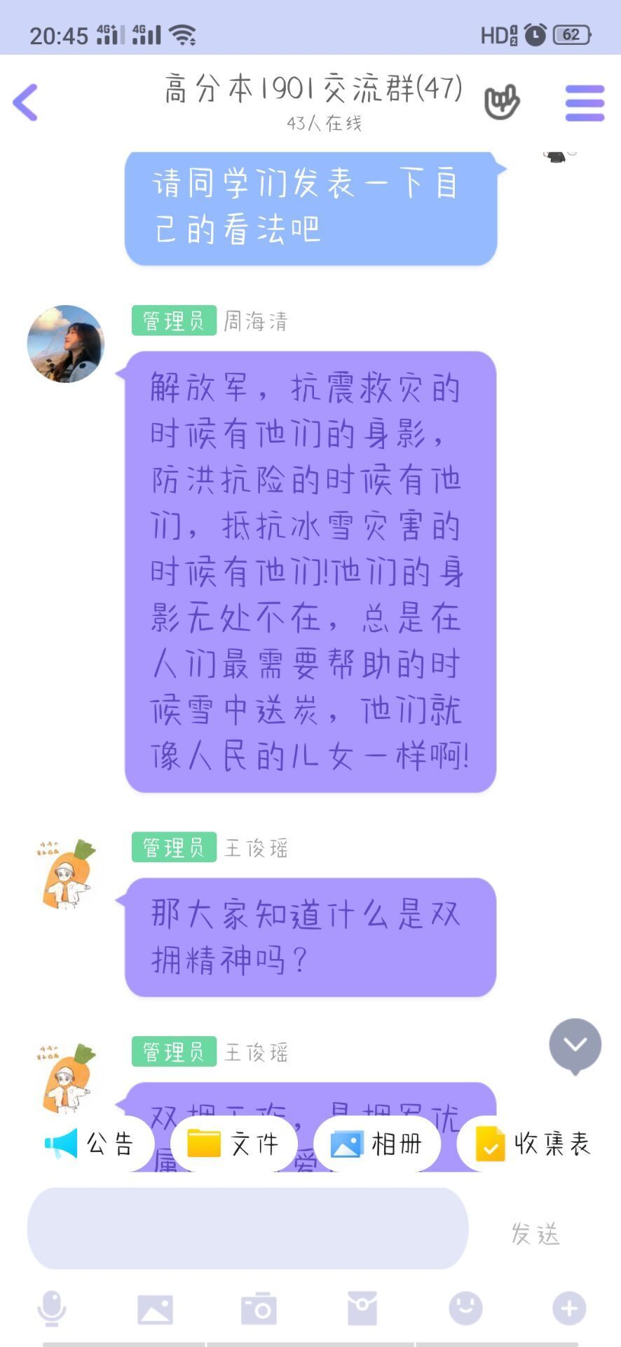 7月28日,hg8868皇冠登录入口手机版开展“敬军人,颂双拥”线上主题团日活动。 活动中,在团支书的带领下同学们学习了“双拥工作”具体内容和时代内涵,增强了拥军爱军意识,深刻体会了构建“民拥军、军爱民”的良好军民关系不仅是社会稳定发展的重要前提,也是在这场抗疫阻击战中能够战胜困难、走向胜利的重要法宝。