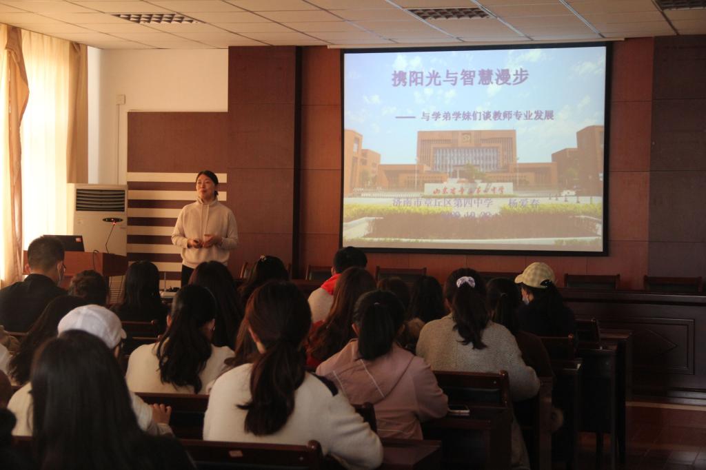 11月12日下午,学院优秀校友、山东省特级教师杨爱春《以携阳光与智慧漫步——与化学师范生谈教师专业发展》为题作了专题报告。讲座对中国学生发展核心素养、高考评价体系、高中化学学科核心思想进行介绍,引导同学们努力成为思维型教师、打造思维课堂。讲座强调了思维育人的前提和关键是教师思维习惯的养成和思维方式的转变,分享了通往思维型教师需要具备的五项思维模式,探讨了打造“创境启思“模式“思维课堂”的方法。