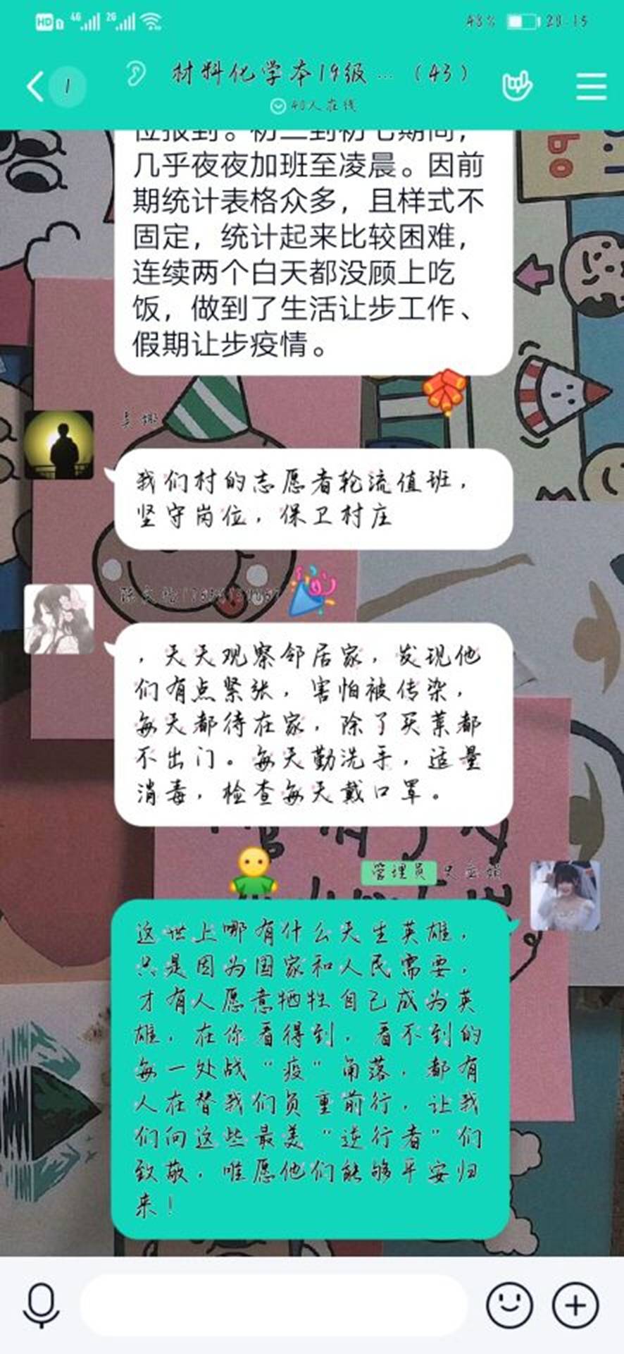武汉新冠肺炎疫情防控前沿及各地防控一线的医疗工作者和守护者用“舍小我,顾大家;舍小家,为国家”的誓言和行动感动了全中国人民。hg8868皇冠登录入口手机版全体学子们的心也被深深的震颤了。2月25日,hg8868皇冠登录入口手机版就如何“做家和国旺的后援人”为主题举行了线上团日活动。辅导老师带领同学们从实时数据、官方辟谣、感人瞬间等环节带领同学们广泛了解目前抗疫现状以及取得的阶段性成果,引导同学们虽然身处“后方”,但一定在非常时期遵守大学生道德规范,传递正能量,“宅”在家里静心用知识和修养为自己“充电”,珍惜老师们现在给予的“网课”知识,以实际行动向一线的医护人员致敬,让党和国家放心,让前线的他(她)们付出的值得,当好国家强盛的后援军。