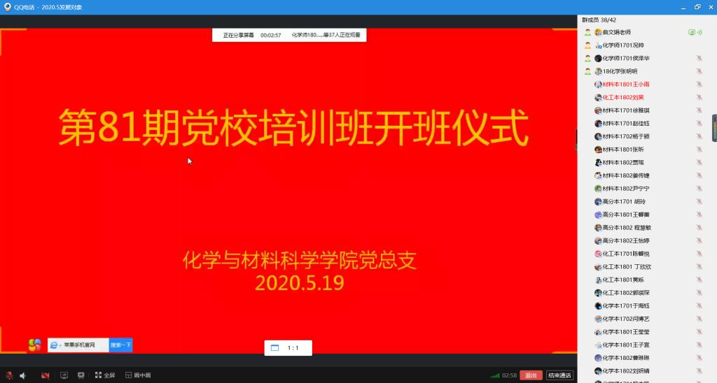 为统筹做好疫情防控及党员发展工作,hg8868皇冠登录入口手机版党总支在规范完成党员发展对象推优入党工作前提下,采用腾讯会议形式于5月19日下午举行第81期分党校培训班开班仪式,35名党员发展对象及90余名入党积极分子参加了开班仪式。仪式结束后,党总支书记于兆玲开讲第一课《不忘初心使命,积极担当作为》。