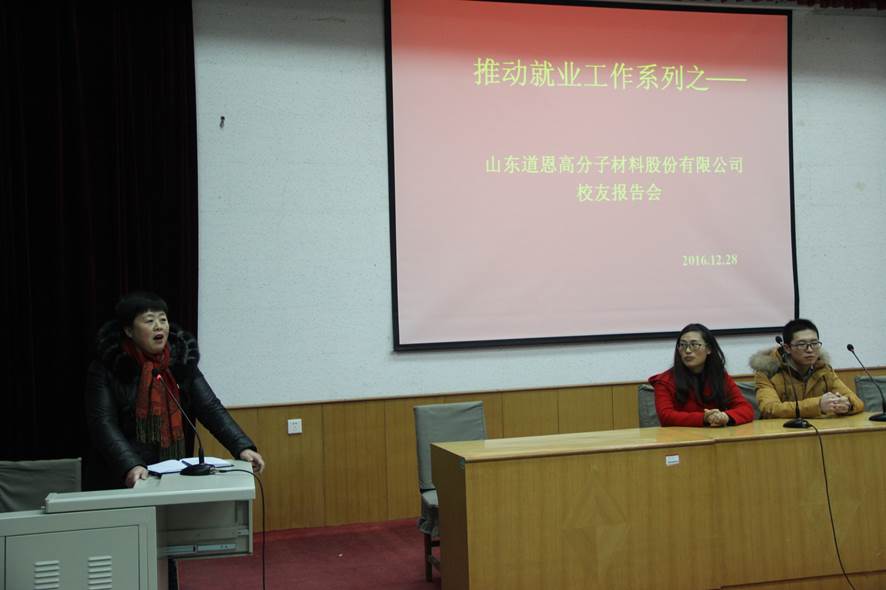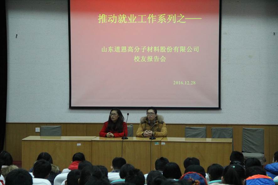 12月28日下午,hg8868皇冠登录入口手机版邀请就职于山东道恩高分子材料股份有限公司的两位校友为2017届毕业生及2014级部分学生做专场报告。此次报告会也是学院推动学生就业工作系列之一。