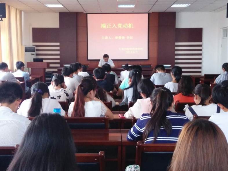 6月21日,在生化楼A307会议室,hg8868皇冠登录入口手机版党总支书记李景奎做了题为“端正入党动机”的党课,第73期发展对象培训班的学员、全体学生党员及部分入党积极分子代表认真听取了党课。