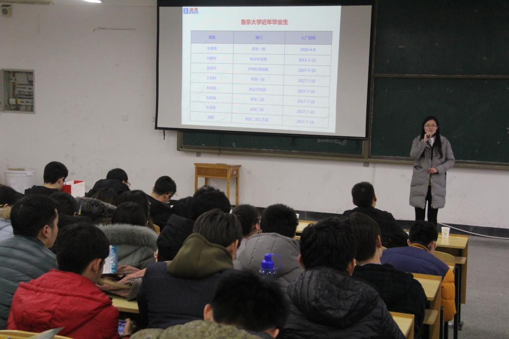2018年1月5日,山东道恩高分子材料股份有限公司招聘宣讲会在hg8868皇冠登录入口手机版举行。道恩集团人力资源管理部张经理,山东道恩高分子材料股份有限公司人力资源部于经理以及任职该企业的优秀校友代表2017届毕业生王彩粉、仇振瑞向2014级毕业生作了招聘宣讲报告。