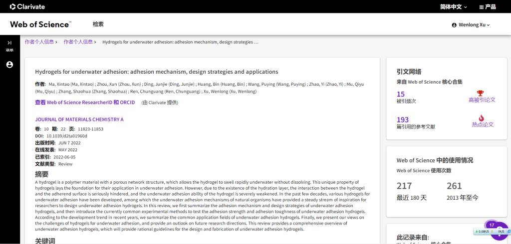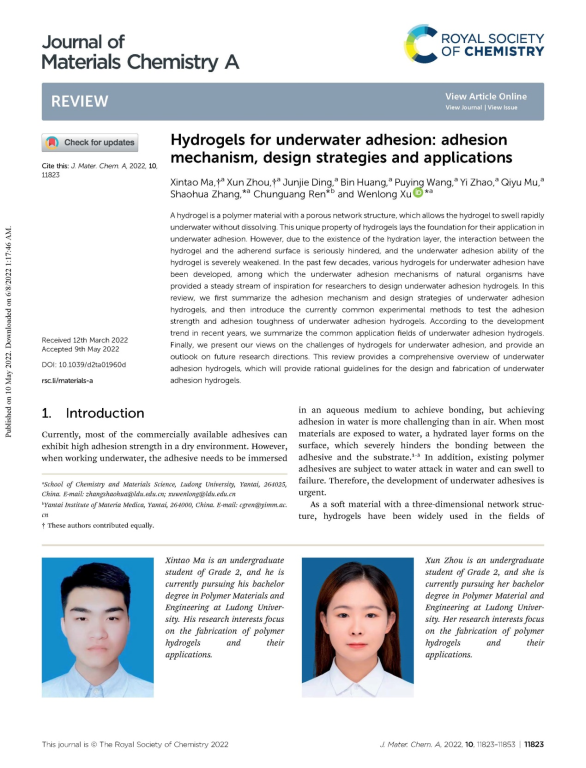 近日,hg8868皇冠登录入口手机版徐文龙副教授指导的本科生团队于2022年5月在中科院一区Top期刊《Journal of Materials Chemistry A》上发表的论文“Hydrogels for Underwater Adhesion: Adhesion Mechanism, Design Strategies and Applications”入选高被引论文、热点论文,并被评为2022年度该期刊最受欢迎的论文,提升了我校在材料科学领域的学科影响力。